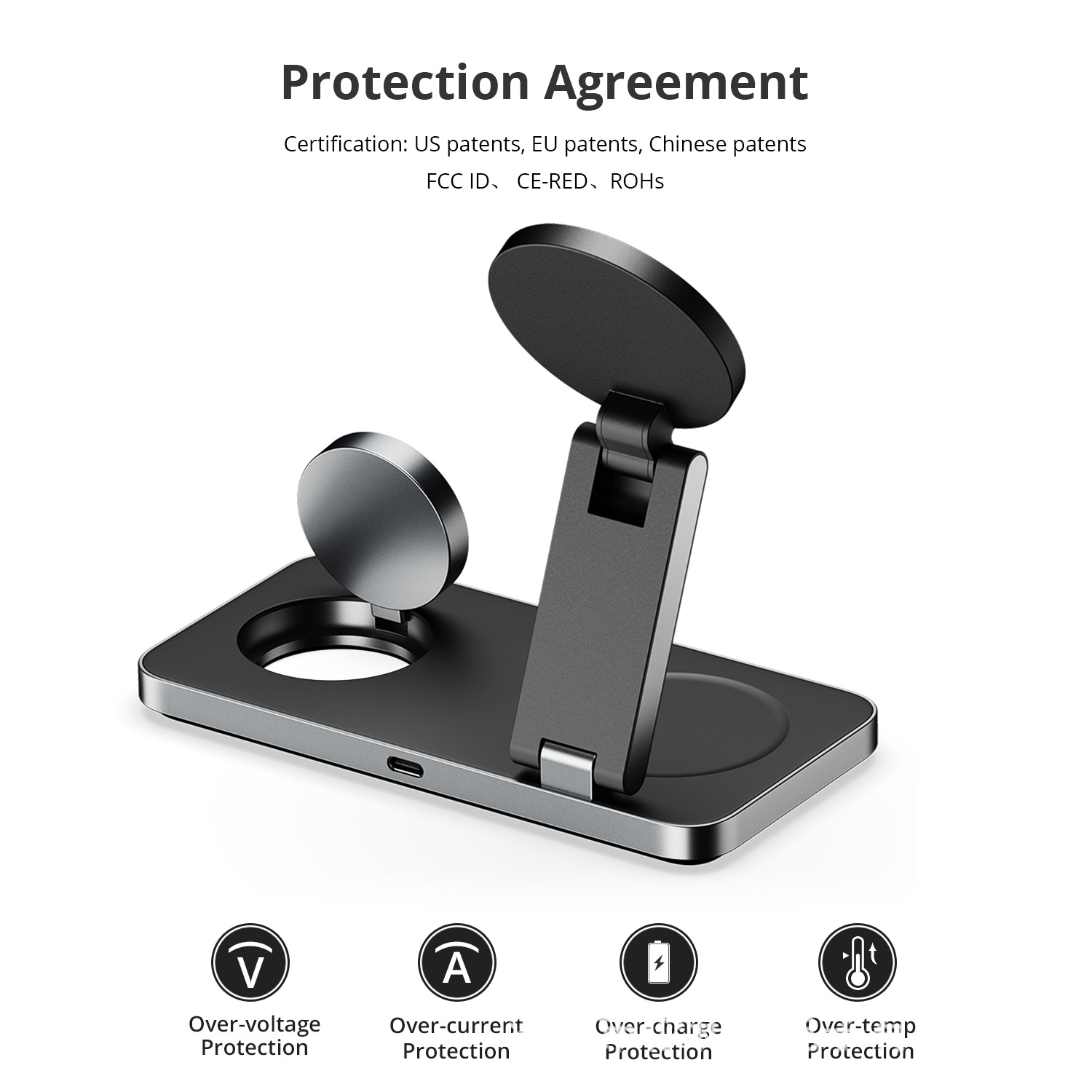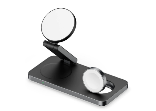 Con su estructura plegable y refinada, integra la carga simultánea de tu smartphone, reloj inteligente y auriculares inalámbricos en un único dispositivo. La tecnología de carga rápida garantiza que tus dispositivos estén listos cuando lo necesites, sin sacrificar la precisión ni la seguridad de tus equipos.